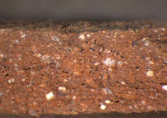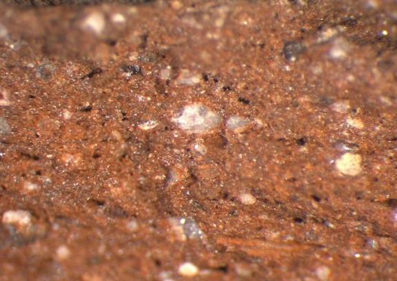 reddish brown, irregular fracture, numerous fine to large white inclusions, mica. |