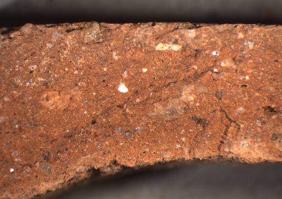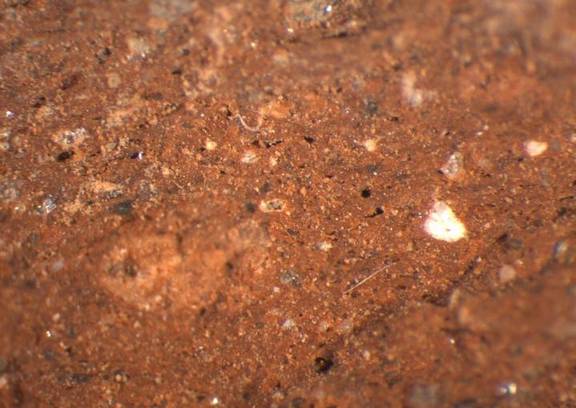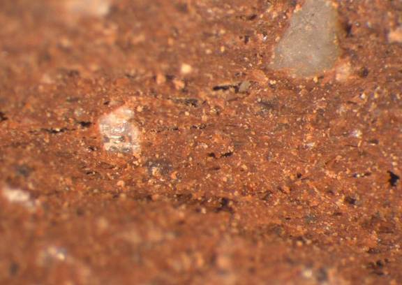 reddish brown, irregular fracture, numerous fine to large white inclusions, mica. |