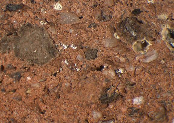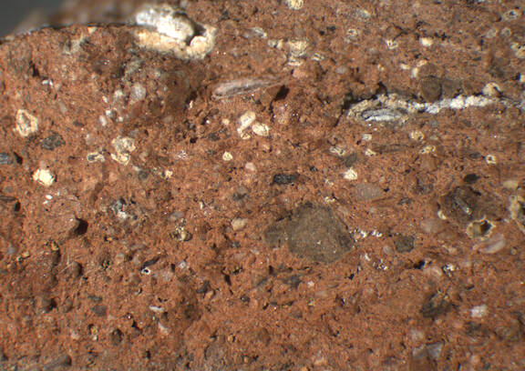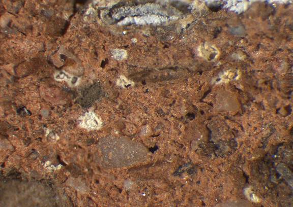 light reddish brown, irregular; numerous fine to very large dark gray inclusions, many small to very large white (carbonate-) particles, mica |