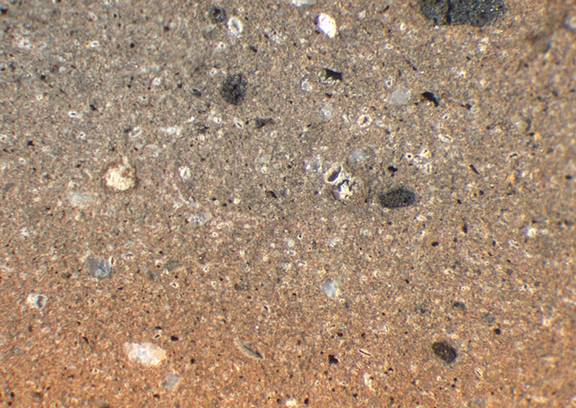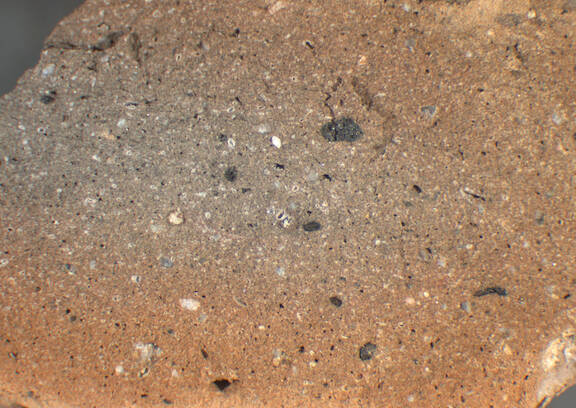 light brown, core: gray, fine; fine to large white, some large dark inclusions |