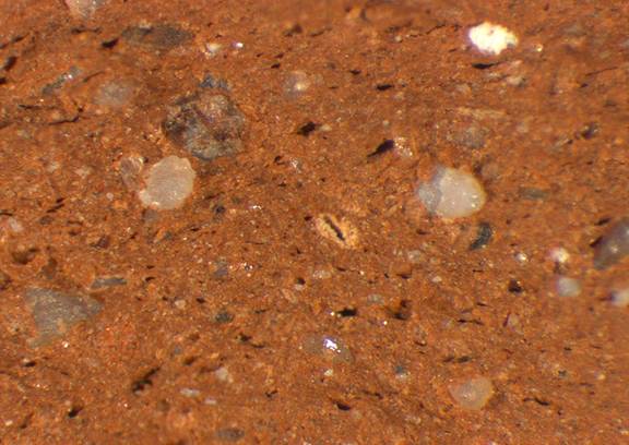 reddish yellow, granular; some larger red inclusions, many fine white inclusions |