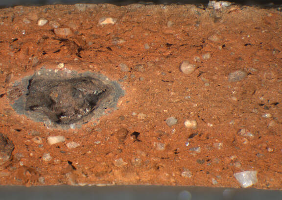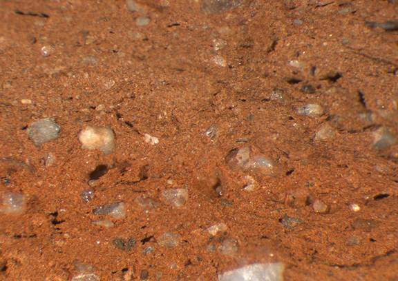 reddish yellow, irregular; many white inclusions of diffrent size, some larger grey inclusions |