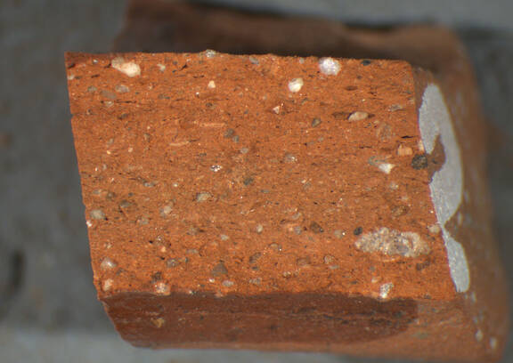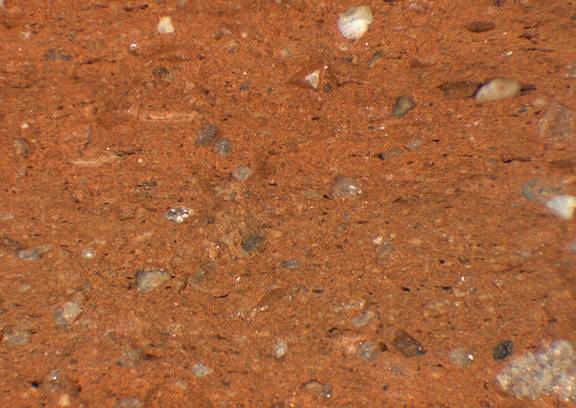 reddish yellow, irregular; many fine white, some red and grey inclusions |