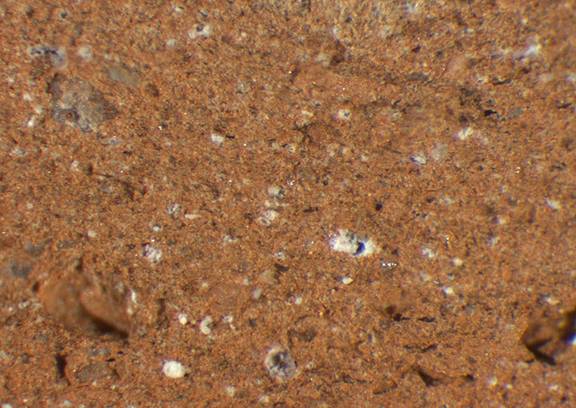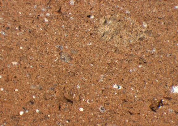 reddish yellow, granular; many fine and medium-sized white inclusions, some light and dark red inclusions, mica |