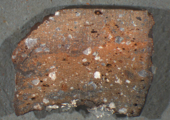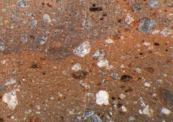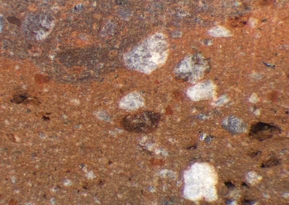 reddish brown, granular; many quartz particles |