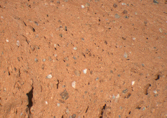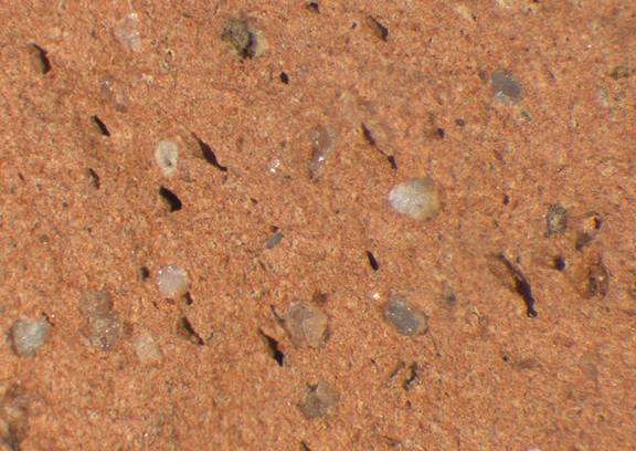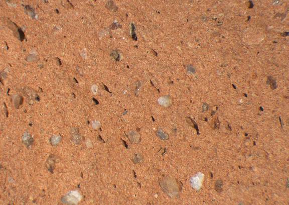 reddish yellow; fine red and white inclusions, medium-sized white inclusions, quartz, mica |