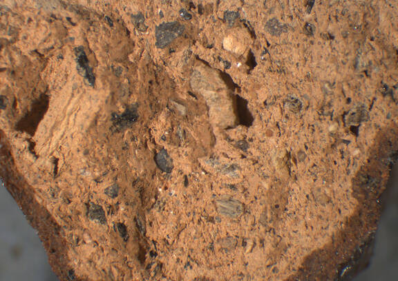 pink, granular; very large dark gray inclusions, sporadic small to medium-sized particles |
