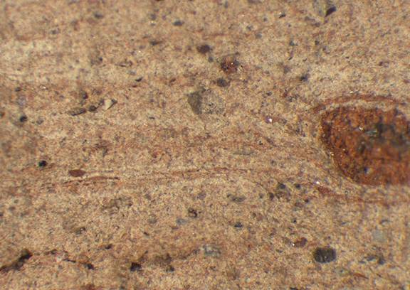 light brown with pale lines, laminated; numerous large to very large reddish brown inclusions, few large white inclusions |