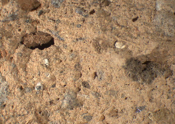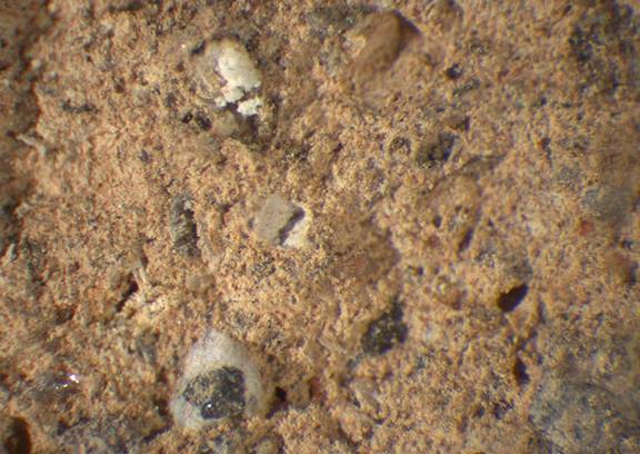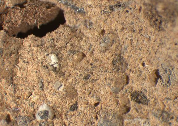pink, granular; large gray and scattered large light red and brown particles, micacious |