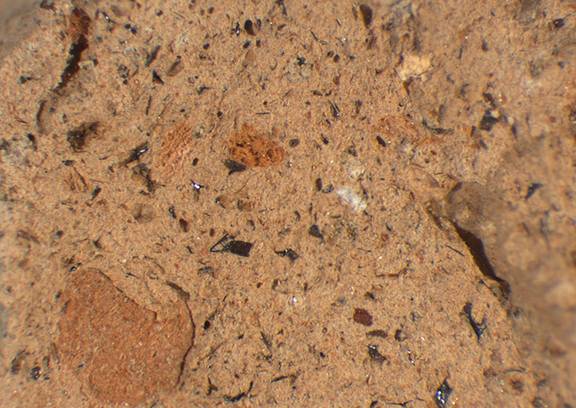 pink, granular; numerous fine to large brown particles, some fine light gray inclusions |