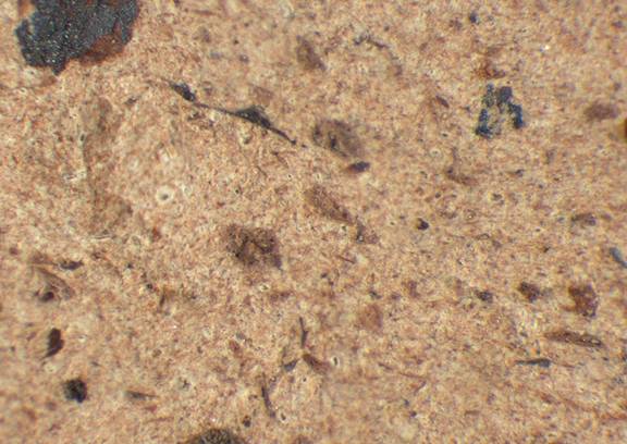 pink, granular; numerous fine to large brown particles, some fine light gray inclusions, sporadic shining light gray inclusions |