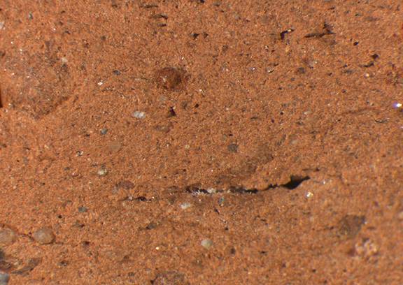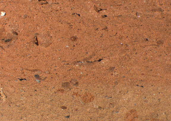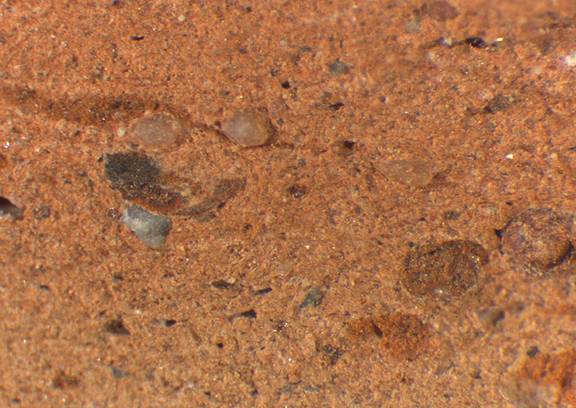 reddish yellow, granular; numerous fine red inclusions, some mid-sized white particles, mica |