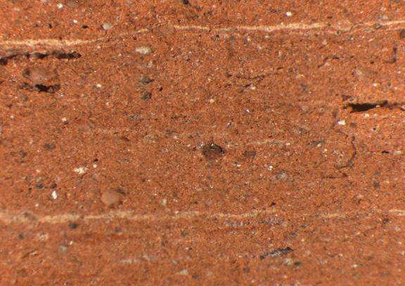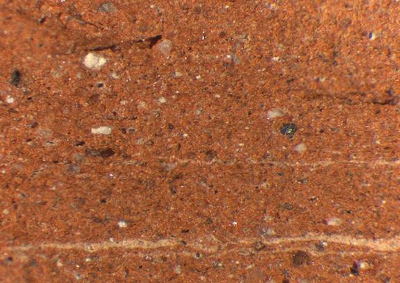 yellowish red with very fine white cords, many white inclusions, large red and black particles |