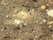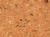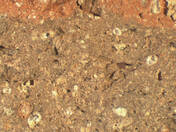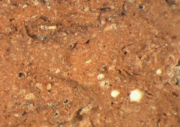 colour red, texture middle fine and compact, numerous fine to large inclusions: yellowish, white, red, grey, voids |