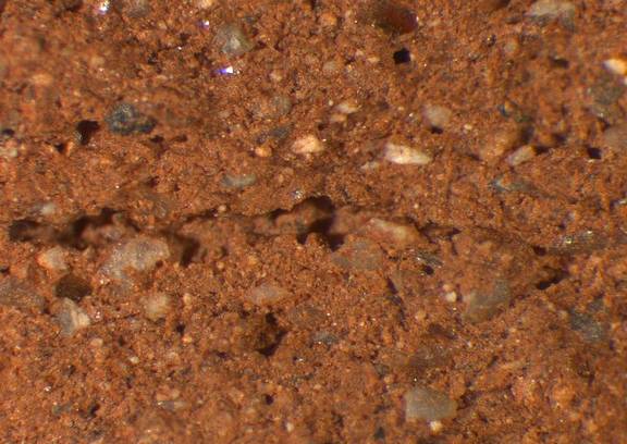yellowish red, granular; some fine to large white inclusions, few fine to large dark inclusions, some mica |