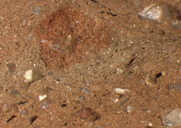 brown, ganular; many fine to large white inclusions, some large red inclusions |