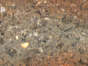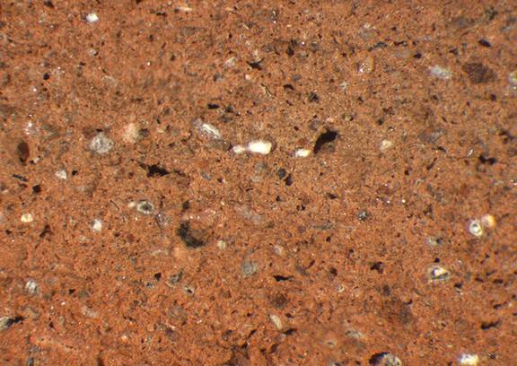 reddish yellow, irregular; fine quartz particles, some mid sized reddish brown and dark gray inclusions, mica |