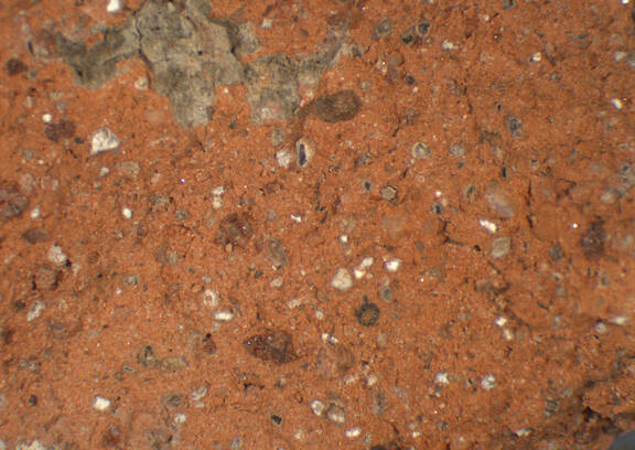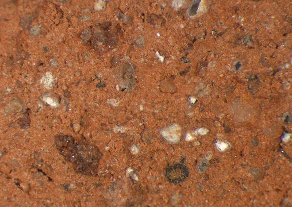 reddish yellow, granular; numerous fine white inclusions, some large reddish brown particles, few dark gray inclusions |