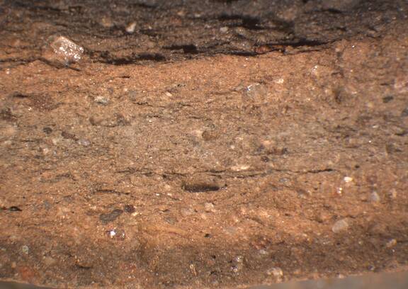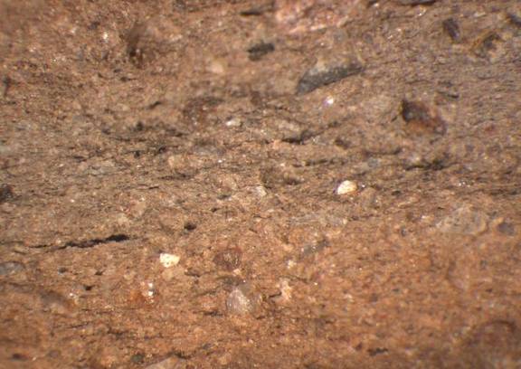 reddish brown, edges dark reddish gray, irregular break, few fine white and dark inclusions |