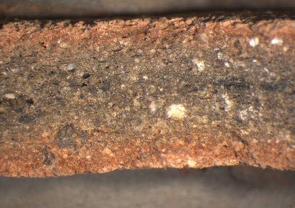 reddish brown, core dark reddish gray, irregular fracture, some fine to large white particles, some large black and brown inclusions, mica |