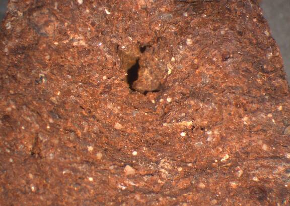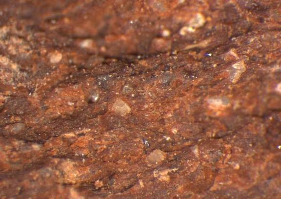 reddish brown, granular fracture, numerous fine white inclusions, some large gray and black icnlusions |