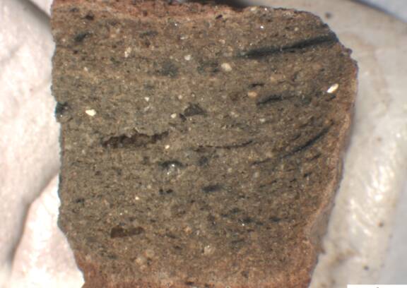 light brown, core gray, irregular fracture surface; numerous white and dark inclusions |