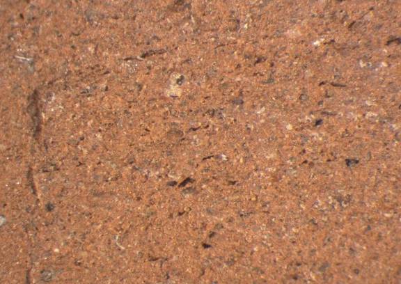 colour red, texture fine and compact, small and few large inclusions: white, grey, red, voids, mica |