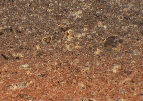 riddled with, well rounded, spherical, yellowish white, 0.03-0.3 |