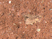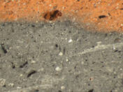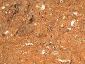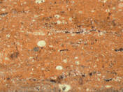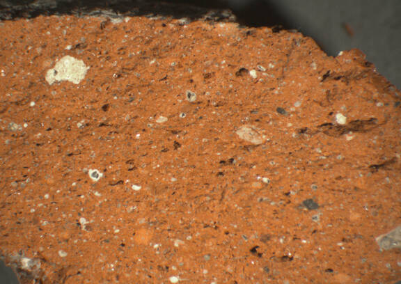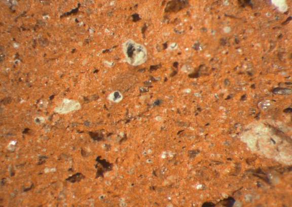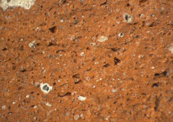 colour red, texture middle fine and compact, numerous small and few large inclusions: white, grey, black, voids |