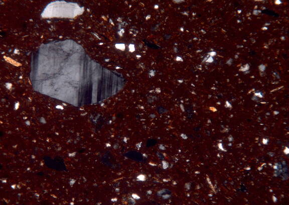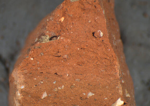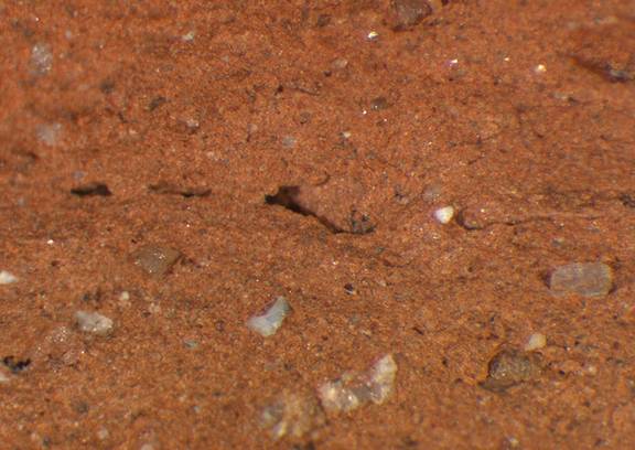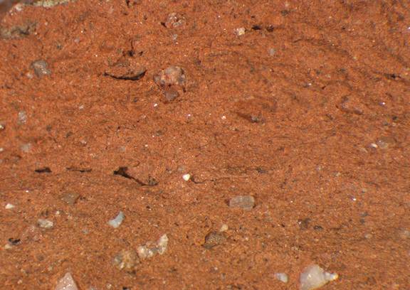 light red, smooth, many fine to large white inclusions, some large dark gray and reddish inclusions |
