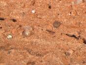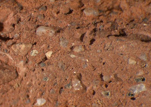 light red, irregular; small to very large white particles, sporadic red and dark inclusions |