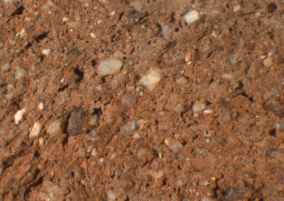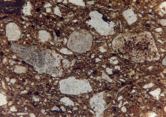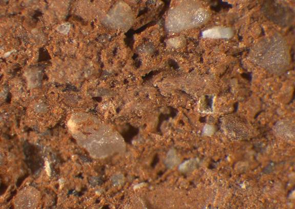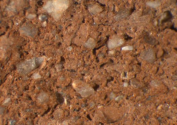 yellowish red, irregular; many medium-sized to very large white inclusions, sporadic large to very large reddisch brown particles |