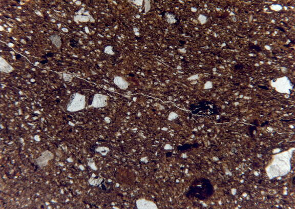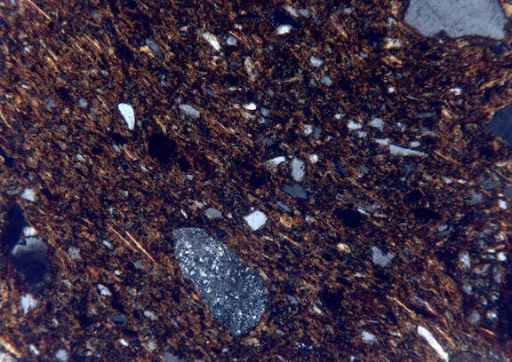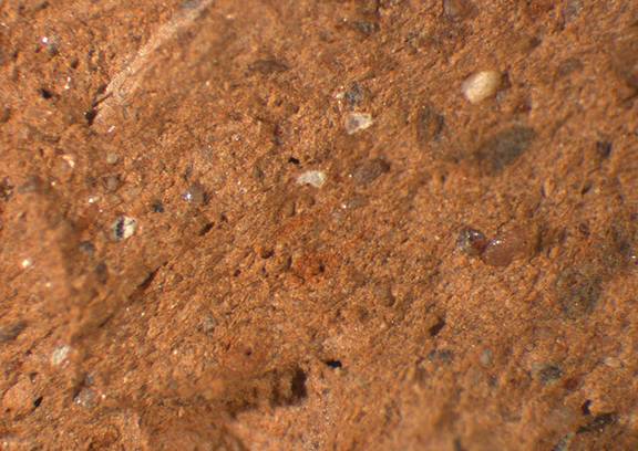 reddish yellow, irregular; many large grey inclusions, fine white particles, sporadic very large reddish brown particles |
